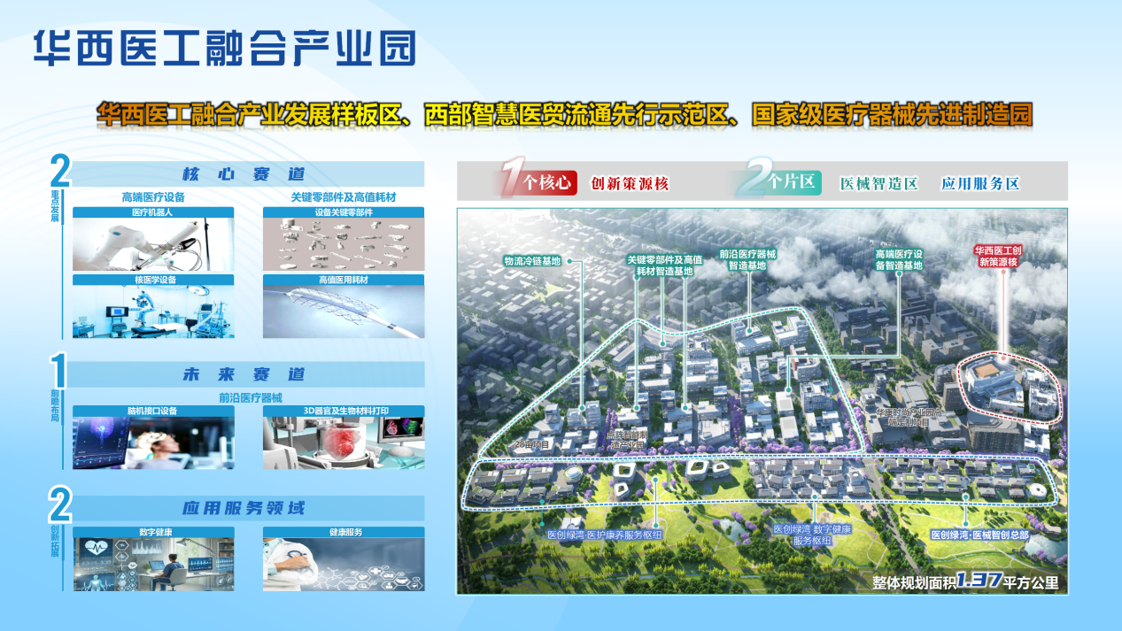 依托华西医学资源,武侯经开区重点发展手术机器人、康复机器人、核医学设备、口腔耗材等高端医疗器械,同时前瞻布局脑机接口、3D打印器官等前沿赛道。园区规划260亩工业用地,分三期建设,未来将形成超100万平方米的高品质产业空间。对企业来说,这里不仅提供产业空间,更重要的是能直接对接华西医院的临床需求和试验平台。企业研发出的新产品,能够更快进入临床验证和市场推广环节。