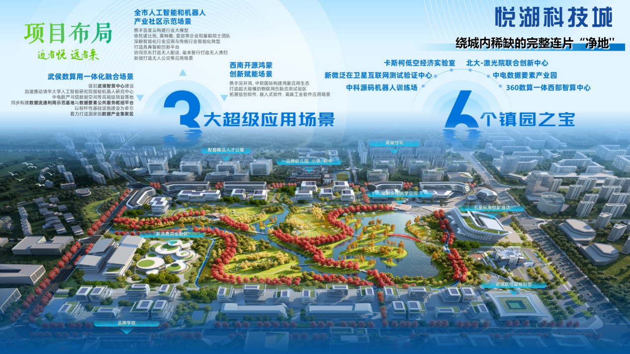 悦湖科技城着力布局3大超级应用场景及6个镇园之宝项目。以武侯数算用一体化融合场景、全市人工智能和机器人产业社区示范场景、西南开源鸿蒙创新赋能场景为主要抓手,汇集卡斯柯低空经济实验室、新微泛在卫星互联网测试验证中心、中科源码机器人训练场、北大-激光院联合创新中心、中电数据要素产业园、数算一体西部智算中心等重要实验室。为人工智能产业发展提供了坚实的技术支撑和广阔的创新空间。