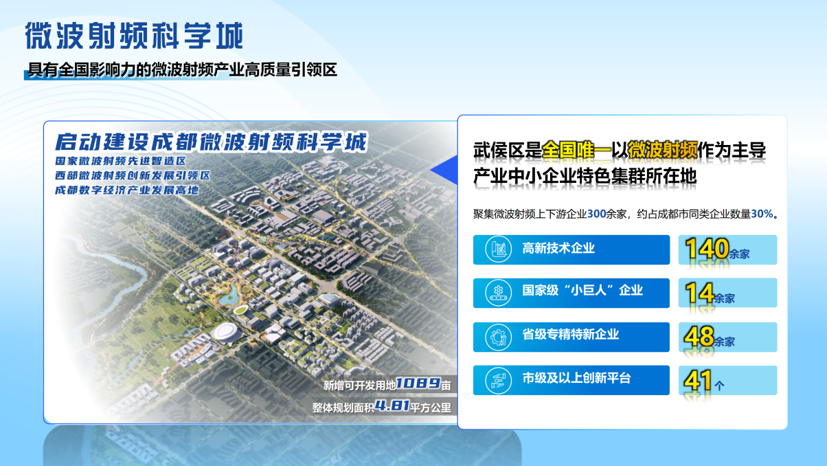 成都市武侯区微波射频产业集群入选工信部首批中小企业特色产业集群,作为目前国内唯一以微波射频为主导产业的特色集群,已形成以射频前端、雷达通信为主体,频谱管理、射频软件测试服务为特色,微波半导体(模组)元器件生产相配套的产业发展格局。聚集上下游企业320余家,其中国家级专精特新“小巨人”企业14家、省级专精特新企业48家,市级及以上军民融合企业55家。在无线电频谱管理、电子对抗等细分领域涌现出华日通讯、能通科技等一批科技企业,多项创新产品应用于成都大运会、神舟任务发射等保障和国防军工重要型号配套。近三年集群企业形成发明专利1004件,企业营收年均增长16%,2024年集群规模突破百亿元。