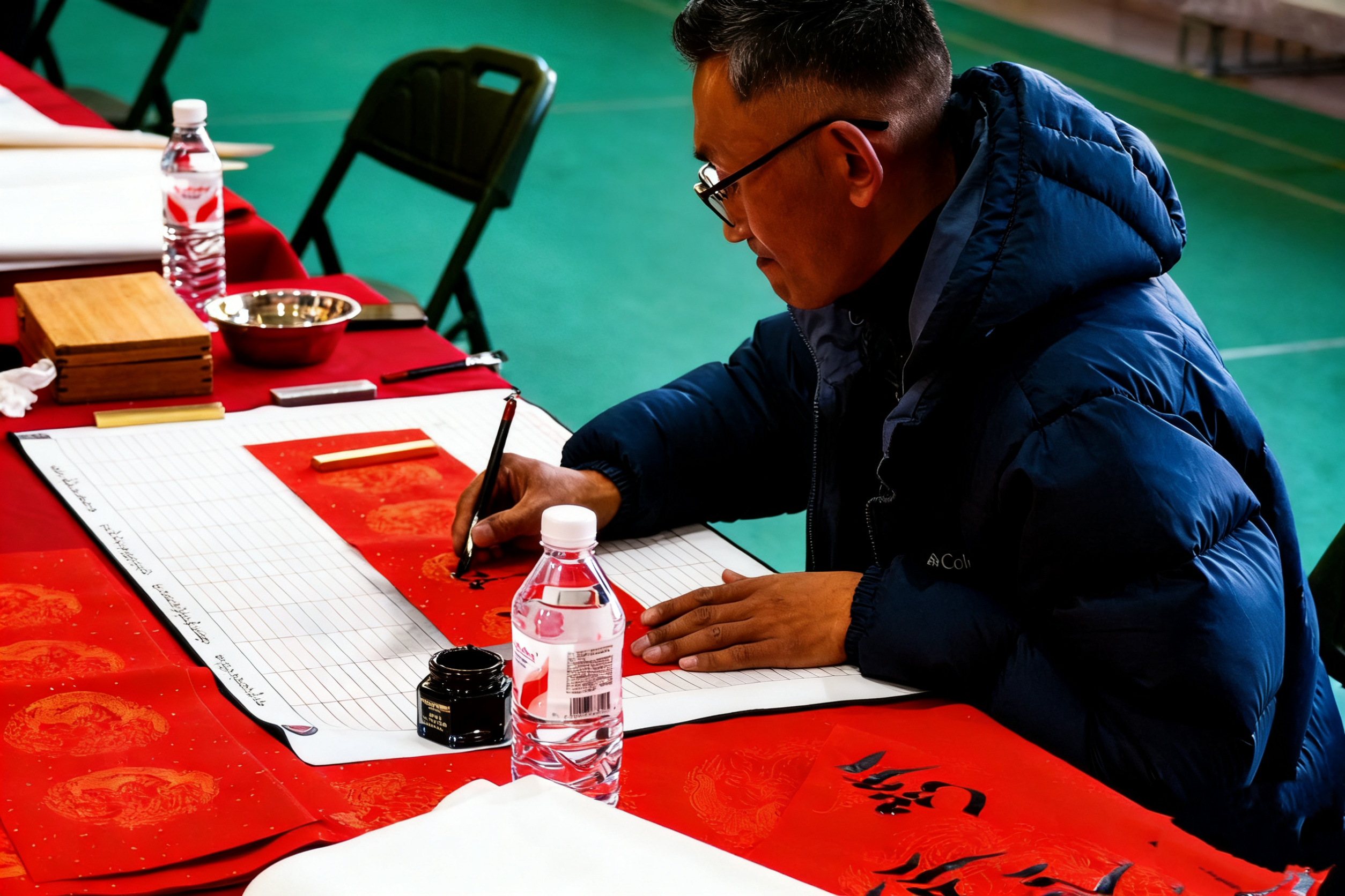 活动进入“写春联送祝福”及观看图片展环节,墨香四溢,年味渐浓。书法家们满怀对人民警察的敬意,挥毫泼墨,一幅幅寓意吉祥、笔力遒劲的春联和“福”字跃然纸上,受到干警们的热烈欢迎和踊跃选取。