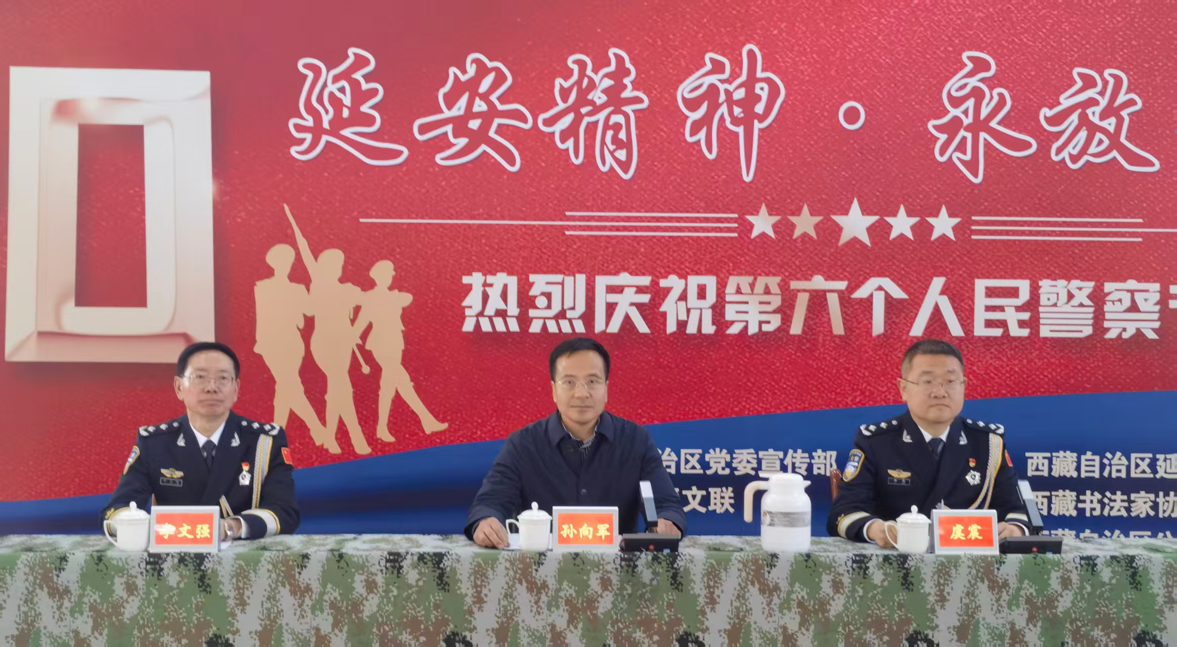 孙向军同志代表主办方致辞,向长期奋战在维稳一线、守护高原平安的全体公安干警及家属致以崇高敬意和诚挚新春祝福,阐述了在新时代弘扬延安精神的重大意义。张冲同志代表西藏书协致辞,表达了以书法艺术服务人民、讴歌时代的理念,为干警送上节日祝福。虞震同志对活动主办方表示感谢,并介绍了警营文化建设情况。活动现场,孙向军同志向机动支队赠送了西藏自治区延安精神研究会最新一期刊物《赓续》。