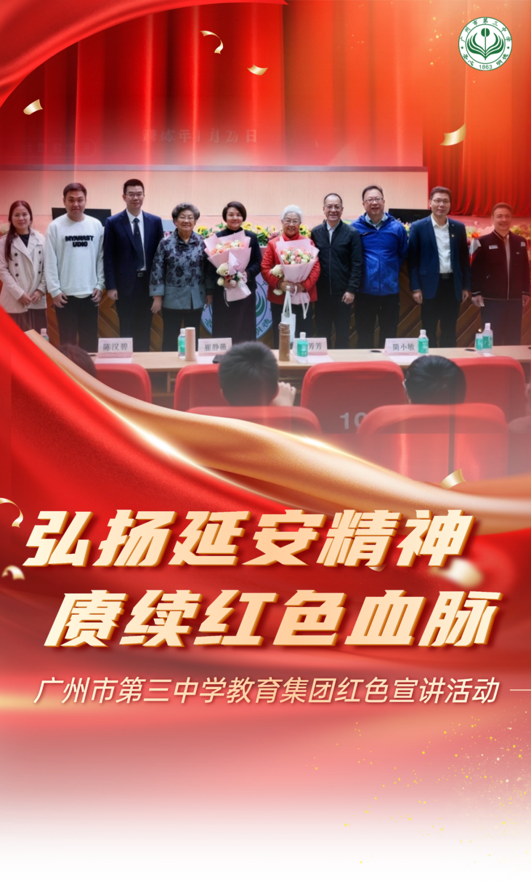 为深入贯彻落实习近平总书记关于“用实际行动把红色基因一代代传下去”的指示精神和“培养担当民族复兴大任的时代新人”的要求。广州市第三中学教育集团初二年级全体杨殷班师生在学校中山报告厅开展主题为“弘扬延安精神赓续红色血脉”的红色宣讲活动。