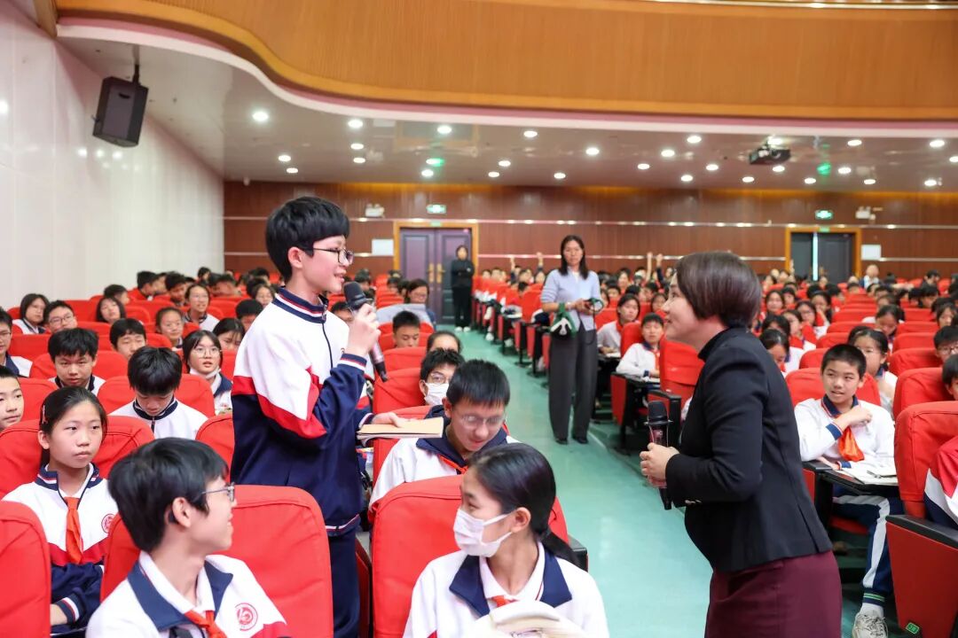 在与学生互动环节中,崔静薇女士问学生们:“杨殷精神是什么?杨殷写给女儿的信有哪些内容?”同学们踊跃积极举手发言:“杨殷精神是‘忧国忧民、廉洁自律、敢于担当、无私奉献’;他在家书中展现的是一位慈父的柔情与一位革命者的刚毅的结合,核心是教育后代要‘继承父志,自立自强,为国效力’。”