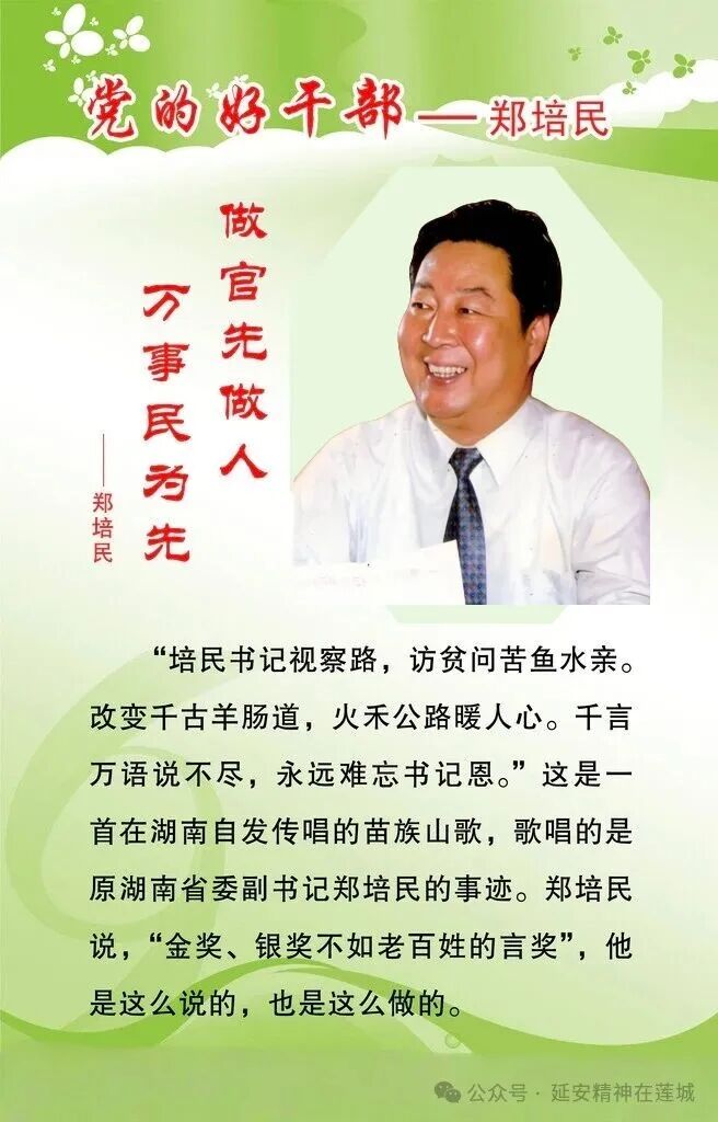 “衙斋卧听萧萧竹,疑是民间疾苦声。些小吾曹州县吏,一枝一叶总关情。”清代郑板桥的这首诗在历史的长河里泛起层层涟漪,其风范穿越数百年时空,在郑氏后人身上展现得淋漓尽致。在湘西的苗寨里,流传着这样的一首歌:“培民书记视察路,访贫问苦鱼水亲。改变千古羊肠道,火禾公路暖人心。千言万语说不尽,永远难忘书记恩。”他爬过湘西最难爬的山,走过湘西最难走的路,去过湘西最穷的村子,住过湘西最穷的人家。两年多时间,他跑遍了全州218个乡镇,住过30多个乡镇。为了尽快解决群众的温饱问题,他成了一只领头雁,飞在苗寨上,带领苗家人民飞向幸福的生活。