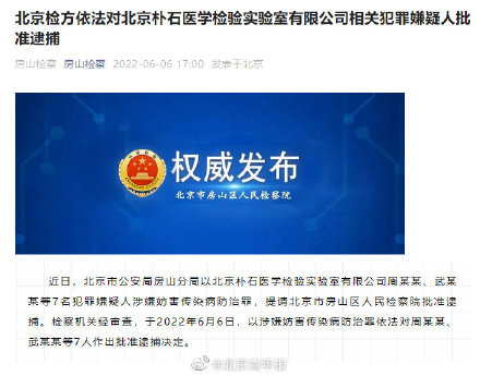 近日,北京市公安局房山分局以北京朴石医学检验实验室有限公司周某某、武某某等7名犯罪嫌疑人涉嫌妨害传染病防治罪,提请北京市房山区人民检察院批准逮捕。检察机关经审查,于2022年6月6日,以涉嫌妨害传染病防治罪依法对周某某、武某某等7人作出批准逮捕决定。