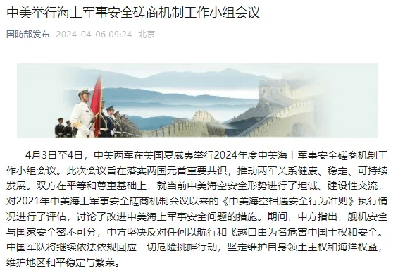 4月3日至4日,中美两军在美国夏威夷举行2024年度中美海上军事安全磋商机制工作小组会议。此次会议旨在落实两国元首重要共识,推动两军关系健康、稳定、可持续发展。双方在平等和尊重基础上,就当前中美海空安全形势进行了坦诚、建设性交流,对2021年中美海上军事安全磋商机制会议以来的《中美海空相遇安全行为准则》执行情况进行了评估,讨论了改进中美海上军事安全问题的措施。期间,中方指出,舰机安全与国家安全密不可分,中方坚决反对任何以航行和飞越自由为名危害中国主权和安全。中国军队将继续依法依规回应一切危险挑衅行动,坚定维护自身领土主权和海洋权益,维护地区和平稳定与繁荣。