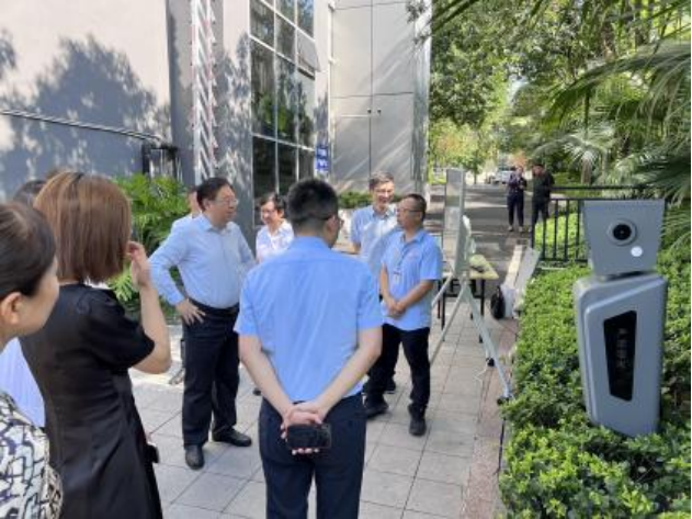 为进一步提升城市管理水平, 确保公共安全, 2024 年 8 月 26日, 重庆市城管局党组书记 、局长李春奎 、副局长张淑钰、 市容处、信息中心、环卫监测中心等部门负责人一行,对有限空 间危险源(化粪池) 人工智能管控机器人进行实地调研。