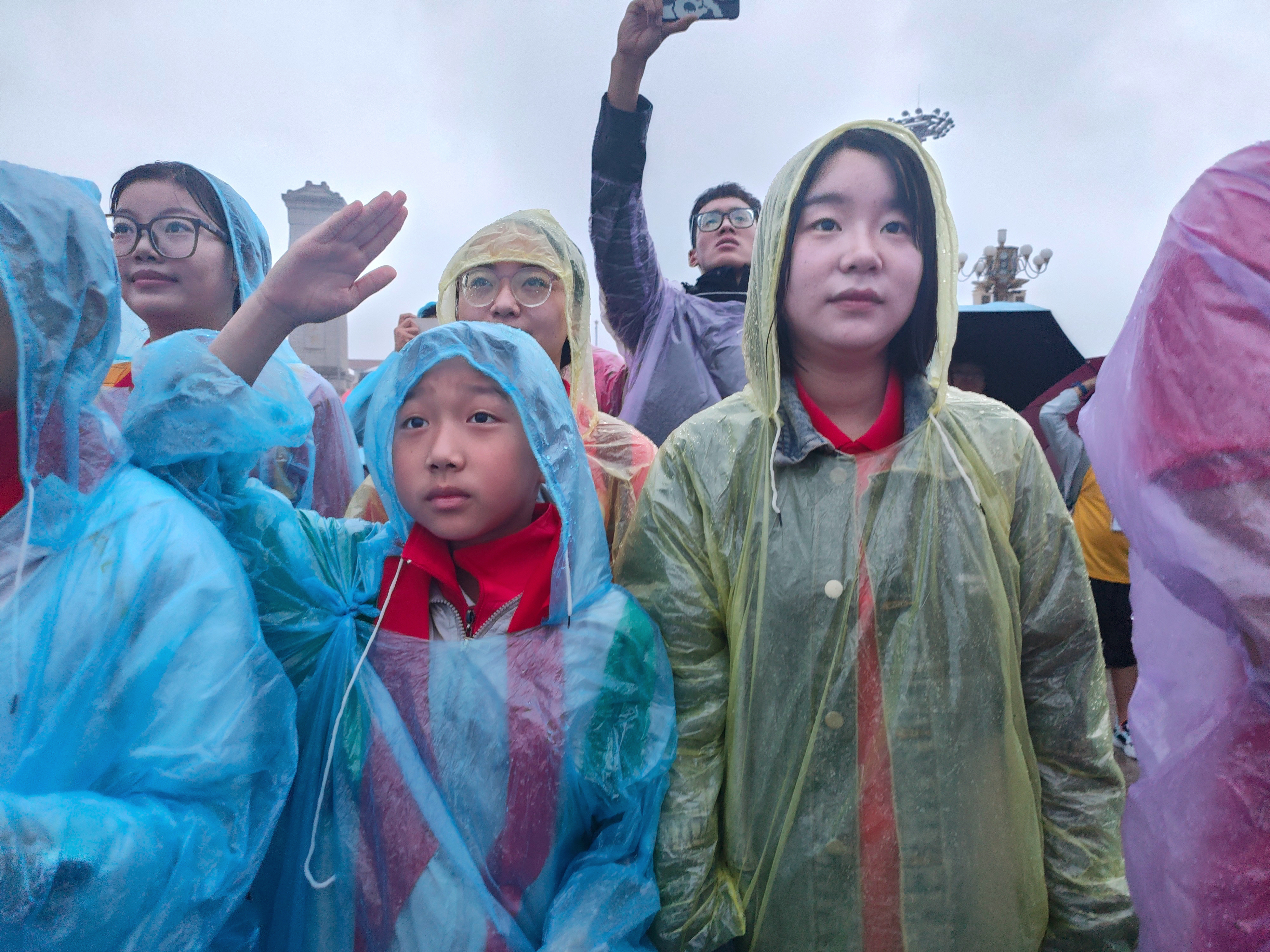 2024年支教回访,来自四川平武的小朋友在雨中的天安门广场升旗仪式现场向国旗行少先队礼