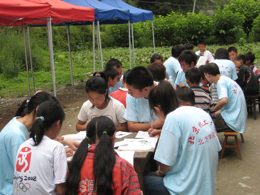 2008年汶川震后,燕京理工学院(原北京化工大学北方学院)全体志愿者在平南羌族乡华光村支教时的情景