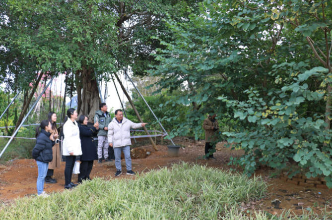 在柳州市园林科学研究所,全国人大代表杨正平(左二)、秦庆芳(左三)调研“太空洋紫荆”育种情况