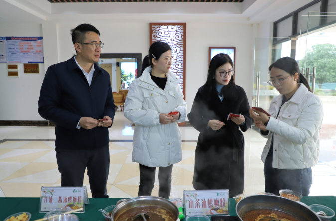在广西三门江生态茶油有限公司,全国人大代表杨正平(左二)、董月琳(左三)品尝对比使用茶油、甘油二酯油等不同健康油脂制作的螺蛳粉,现场评估其风味与品质。
