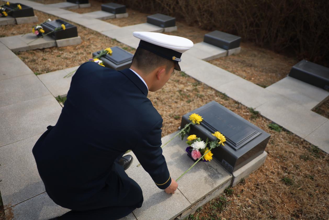 (学员为烈士墓碑敬献鲜花)