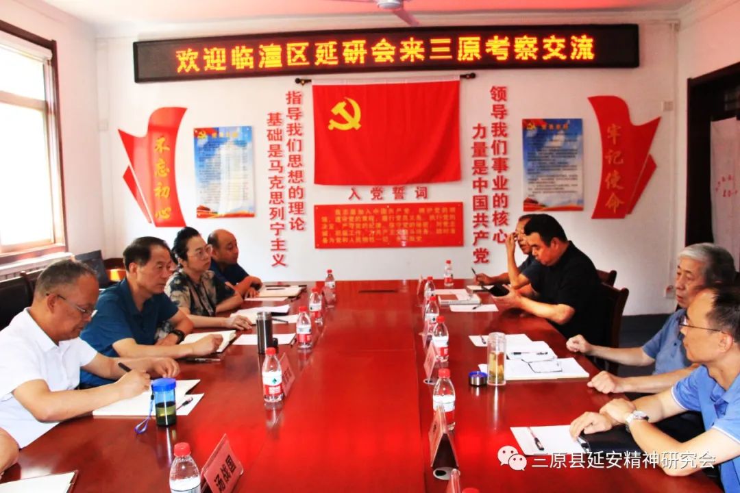 8月2日,陕西省西安市临潼区延安精神研究会会长张双学带领秘书长王朝晖,副秘书长黄彦成、李引良、汤战国等来咸阳市三原县延安精神(渭北红色文化)研究会考察交流工作。中共三原县委常委、宣传部部长田广军会见了临潼区研究会同志,对临潼区同志来三原考察交流表示欢迎;三原县延会会长侯世祥介绍了有关情况;三原县延会常务理事、宣讲团副团长、县委宣传部副部长麻军峰,县延会常务理事、宣讲团副团长、县委党校副校长杨方,县延会常务理事、副秘书长兼办公室主任孙谦等参加座谈。