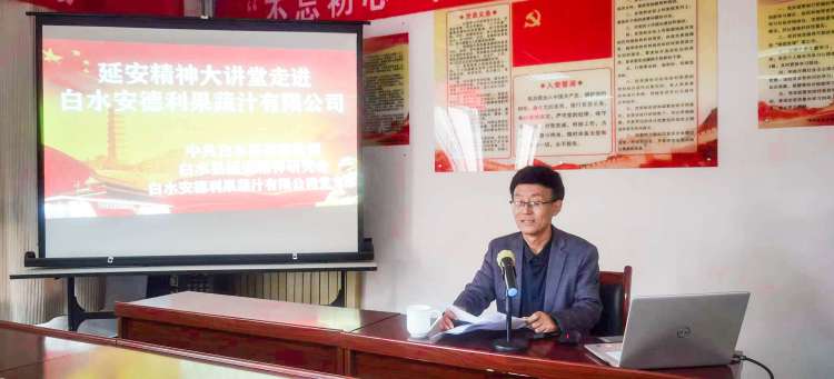 10月26日,中共陕西省渭南市白水县委宣传部、白水县延安精神研究会宣讲团走进白水安德利果蔬汁有限责任公司开展主题宣讲活动。白水县延安精神研究会副秘书长王巍作了《用好传家宝 奋斗三个年 为白水县域经济高质量发展做出贡献》主题报告。报告会由白水安德利果蔬汁总经理黄连波主持,公司中层以上干部参加会议。