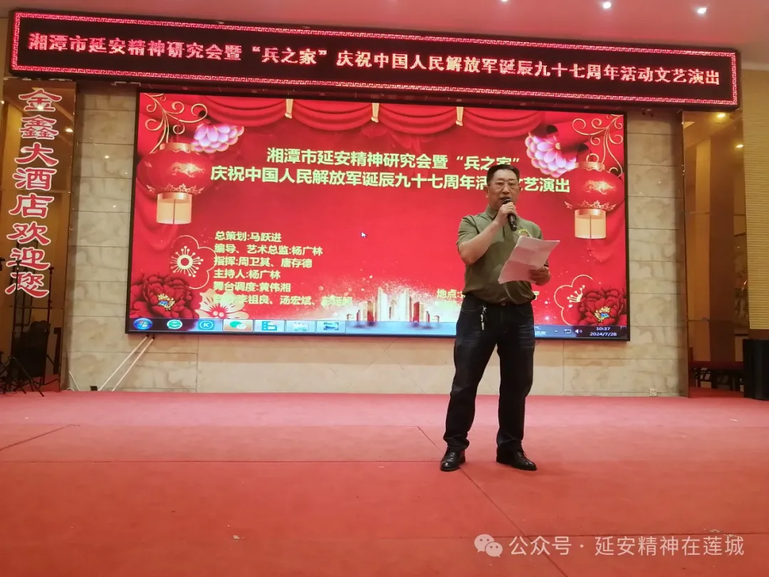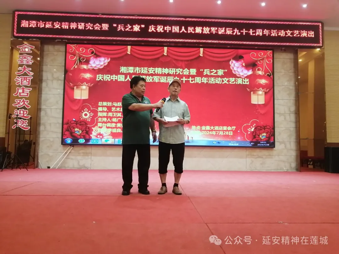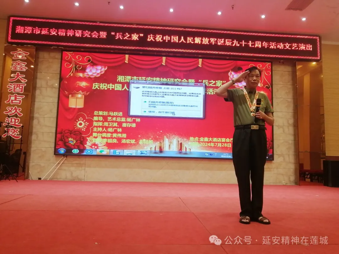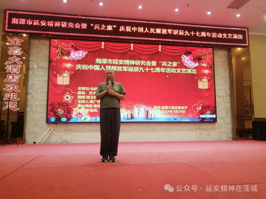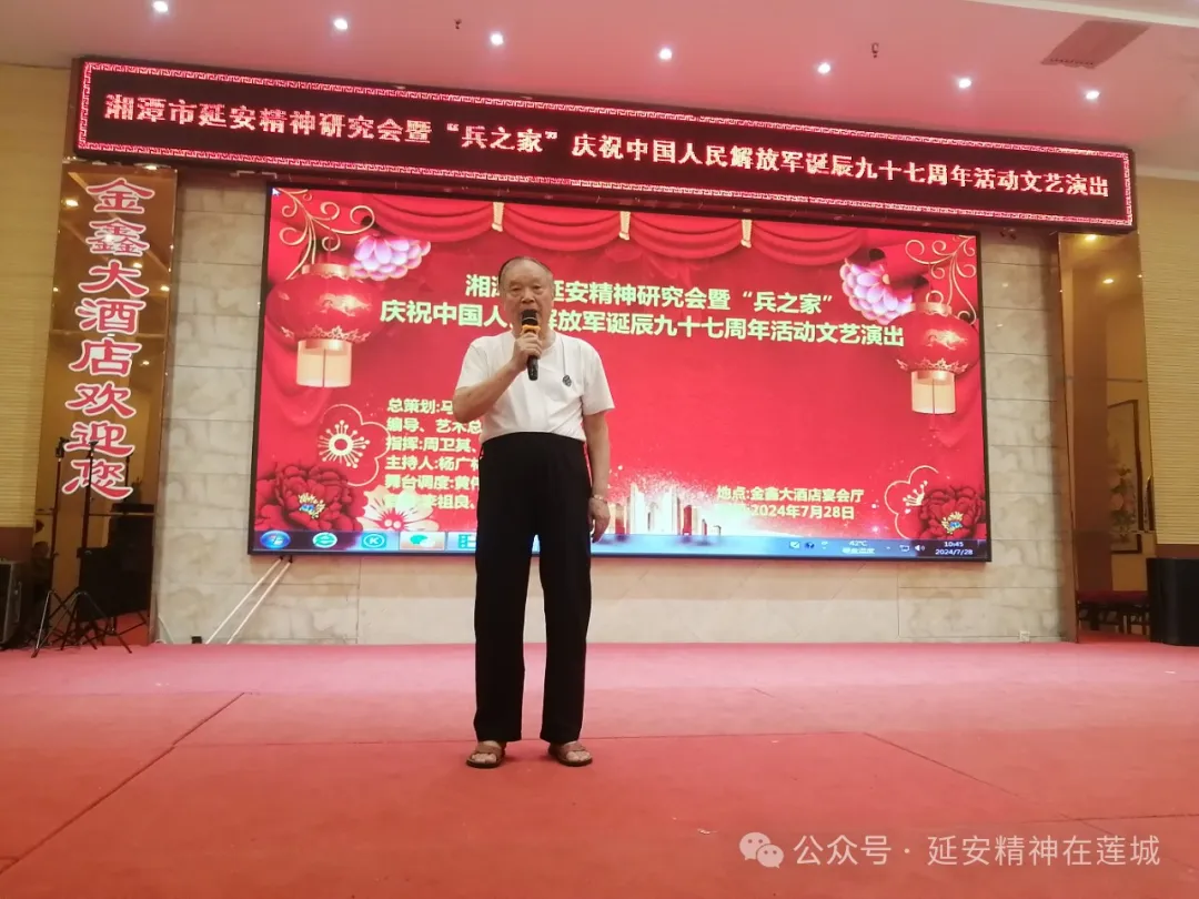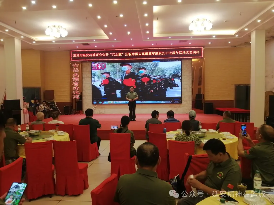 为庆祝中国人民解放军建军九十七周年,进一步增强退役军人的荣誉感、责任感和使命感,大力弘扬我军的优良传统, 7月28日,湖南省湘潭市延研会第八组(兵之家)在金鑫大酒店宴会大厅隆重举行学习党的二十届三中全会、庆祝“八一”建军节暨文艺演出活动。