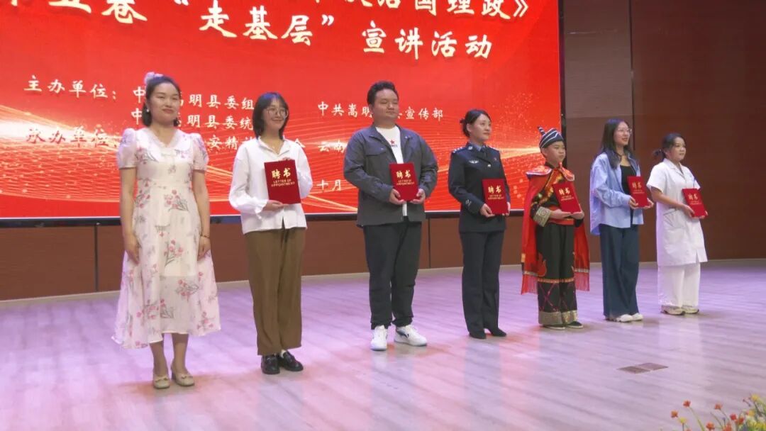 在第二阶段的《习近平谈治国理政》第五卷“走基层”宣讲活动中,参会县领导为第七批“嵩明先锋讲师暨‘嵩理宣’金话筒理论宣讲员”颁发了聘书;并为荣获纪念中央红军长征过嵩明90周年弘扬伟大长征精神、延安精神优秀文艺作品比赛“线上”获奖作品和第三届“理在崧盟·飞同凡响——党的创新理论我来讲”理论宣讲暨“党课开课啦”比赛的获奖选手、优秀组织单位颁奖。