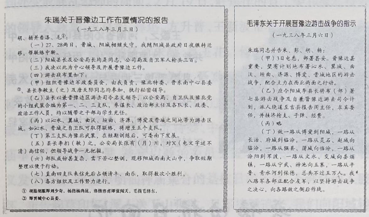 3月3日,朱瑞在横河这镇下寺坪就开辟建立以阳城为中心的晋豫边抗日根据地的具体部署报告中共中央毛泽东、张闻天和中共中央北方局刘少奇、杨尚昆,3月6日,朱瑞收到中共中央毛泽东的复电,并作了具体指示。毛泽东称“部署甚妥”并在电报中指示“晋豫边甚重要,望有计划的部署沁水、翼城、曲沃、垣曲、济源、博爱、晋城地区游击战争,配合主力在西北两面之行动”。