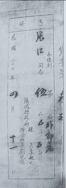 1938年4月11日,唐天际对民运科长田民说:“小田,你是阳城人,对这里比较熟悉,眼下,咱们部队人员增多,不能饿着肚子村仗,光靠挖野菜充饥不仅不是根本办法,而且长期下去还会闹肚子。同时,我们也要帮助国民党友军筹点粮草,不然,他们会去老百姓家中抢粮。你看行不行?”随之,田民带着几个民运工作队员找到时驻下寺坪后寺沟的阳城抗日县政府,并与县政府经济科长刘晓晴一并来到外郎庄村向群众借粮。当该村老百姓得知“唐支队”来借粮时,纷纷自愿捐献粮食。该村村副张江一下就向子弟兵捐粮五石(按:约合500斤),解决了当时吃饭问题的燃眉之急。田民等人十分感谢乡亲们,并握着乡亲们的手说:“太谢谢你们了!太谢谢你们了!”接着,县长李敏之托经济科长刘晓晴代表县政府给张江打了一张借粮条,并表示日后归还。而这张借粮条,张江怎么也不肯收,他说:“你们扛枪打仗,是为我们老百姓的,这五石粮是我们捐给八路军的,还打什么欠条!”然而,八路军铁的纪律是不允许白拿老百姓的。因此,在田民、刘晓晴再三解释下,张江才收下了这张借粮条(就是这张欠条,后来演绎了1992年1月8日时任晋城市委书记王云龙,带领阳城县委书记张仁仓、县长郭保刚等人到外郎庄还粮的故事)。