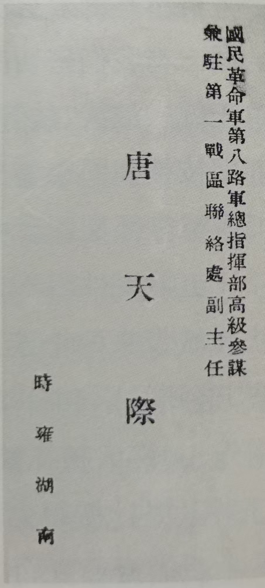 1938年5月下旬,唐天际司令员由于过度劳累而身患重病。下寺坪于忠老人及其老伴主动将唐天际接到自己家中予以精心照顾。两位老人不是为唐天际熬汤煎药,就是给他做上可口饭菜,使唐天际身体很快得到康复。为了感谢于忠家人,唐天际特拜于忠为干父,拜老太太为干娘。唐天际病愈离开下寺坪之时,特向两位老人留下一张名片,并告诉老人说:“这是我的名片,你们留着。我走后如果遇到中央军来,你拿出来可能有用,但日本人来了你们可绝对不敢拿出来。”这张小小的名片,于忠夫妇一直珍藏在身。于老太太去世之时,又将这张名片交给了孙女于花琴,于花琴同样作为无价之宝珍藏在身,直至如今。
