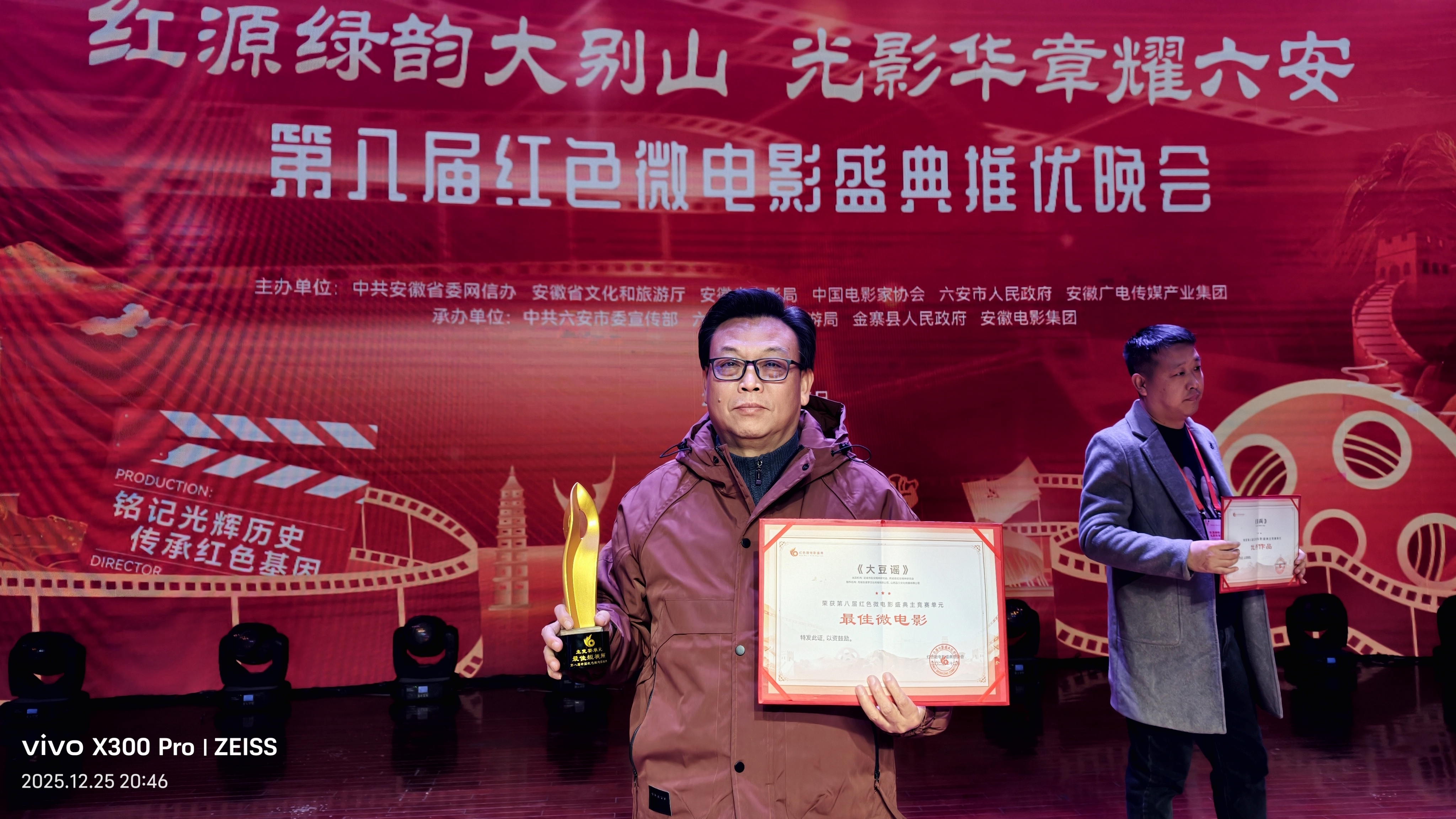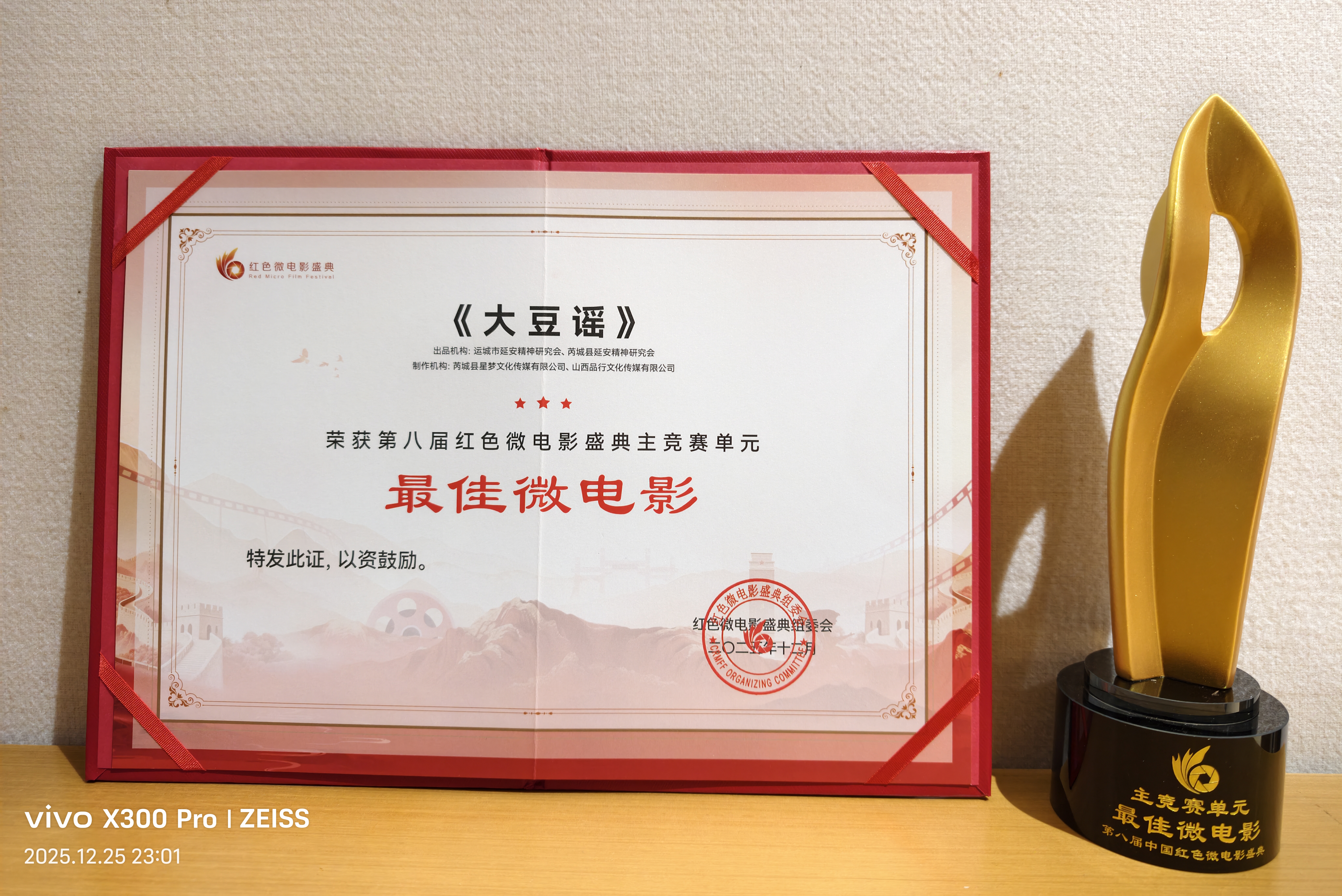 红源绿韵大别山,光影华章耀六安。12月25日晚,第八届中国红色微电影盛典推优典礼在安徽省六安市金寨县“中国红色微电影剧院”隆重举行。由运城市延安精神研究会和芮城县延安精神研究会联合出品的《大豆谣》荣获最佳微电影。
