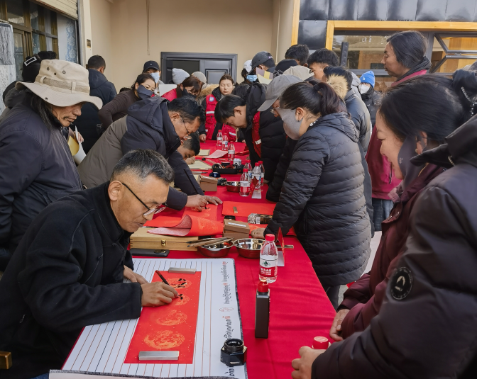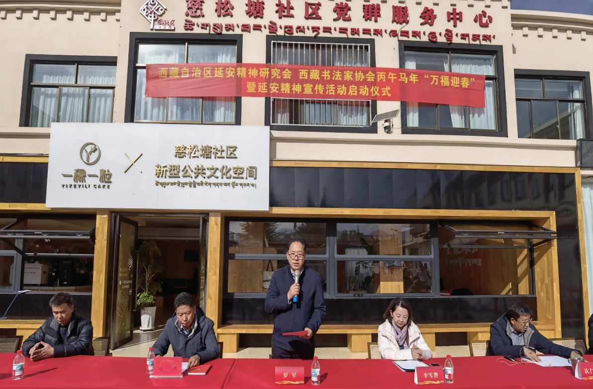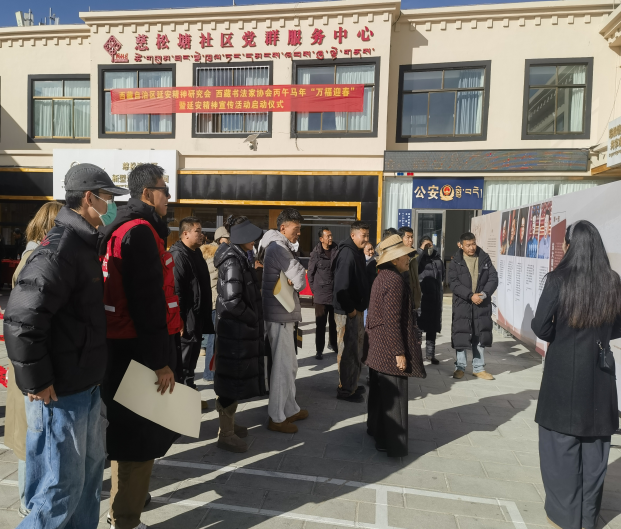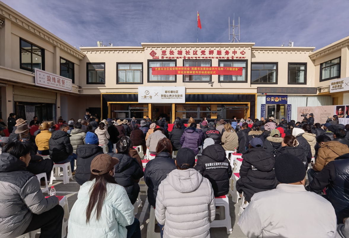 为深入学习贯彻党的二十届四中全会精神和习近平文化思想,弘扬中华优秀传统文化,赓续红色精神血脉,丰富群众节日文化生活,2026年1月9日下午,西藏自治区延安精神研究会联合西藏书法家协会,在拉萨市城关区娘热街道办事处慈松塘社区隆重举办丙午马年“万福迎春”暨延安精神宣传活动启动仪式。活动以写春联、送万福、观展览等群众喜闻乐见的形式,将传统书法艺术与红色文化有机结合,传递新春祝福,弘扬延安精神,助力文化强区建设,推进中华民族共同体意识深入人心。