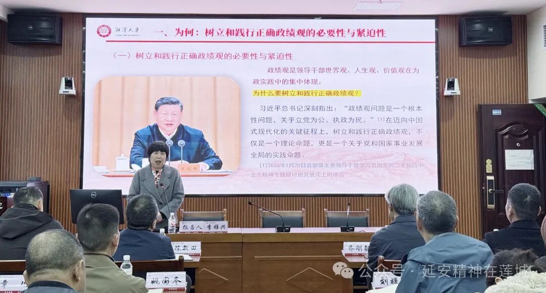 为深入贯彻落实在全党开展的树立和践行正确政绩观学习教育活动,2026年3月26日上午,湘潭市延安精神研究会理事、湘潭大学马克思主义学院李雅兴教授为湘潭市烟草专卖局党员干部作了《树立和践行正确政绩观创造经得起实践、人民、历史检验的实绩》的专题报告。