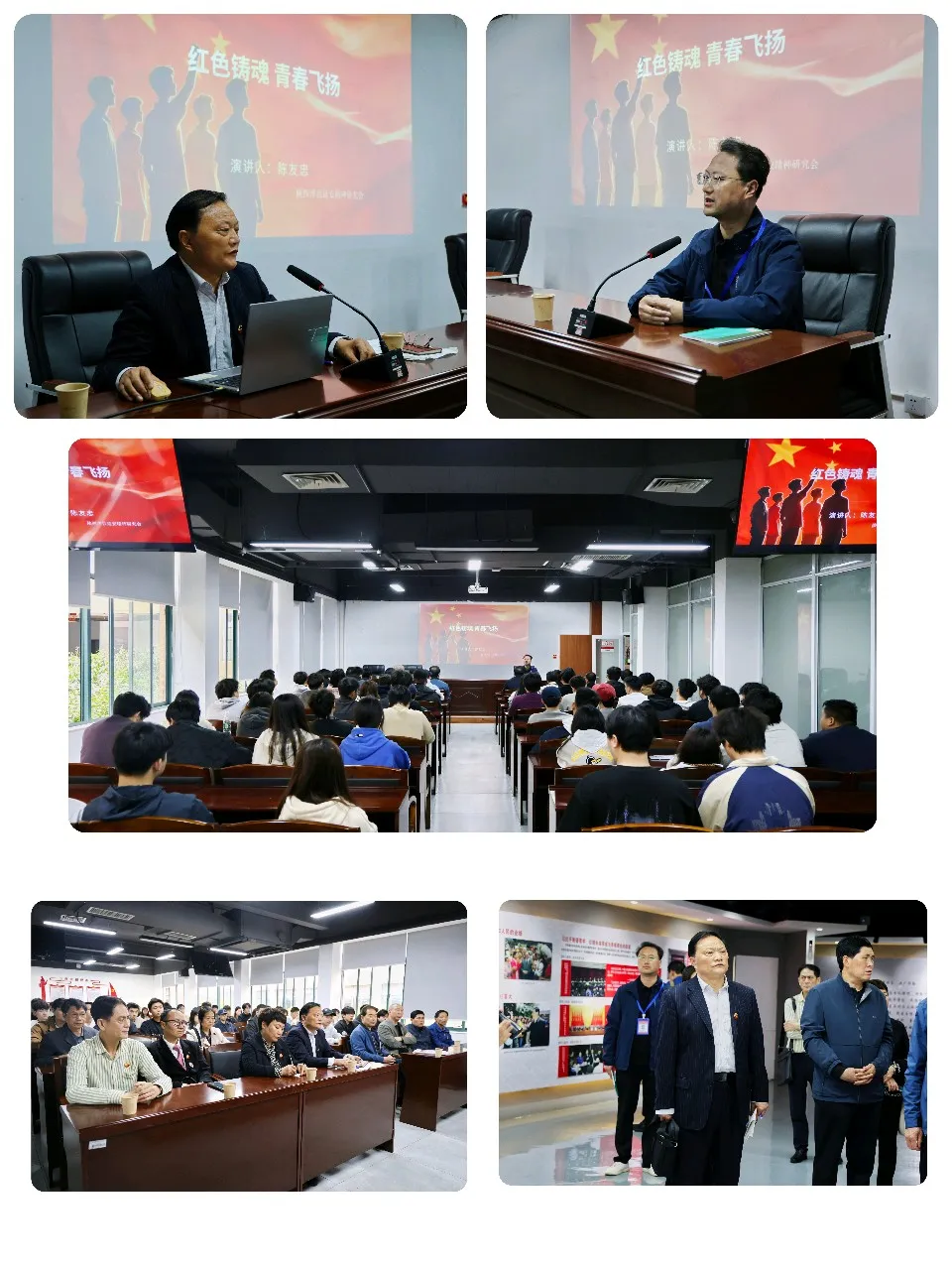随后,考察团在湘潭市延研会副会长李宁陪同下,前往湘潭职业院校“工匠红苗”培育工程轮值单位——湖南城建职业技术学院,实地调研“工匠红苗”培育工程推进情况,参观学院党史馆与办学成果展,深入了解院校红色育人实践。该院副院长任永辉介绍了学院办学概况、育人特色以及“工匠红苗”培育工程推进情况。陈友忠会长应邀为该院学子带来《红色铸魂,青春飞扬》专题讲座,结合延安革命历史与地方发展实践,阐释延安精神内涵,勉励青年学子传承红色基因、勇担时代使命,赢得在场学生热烈反响。