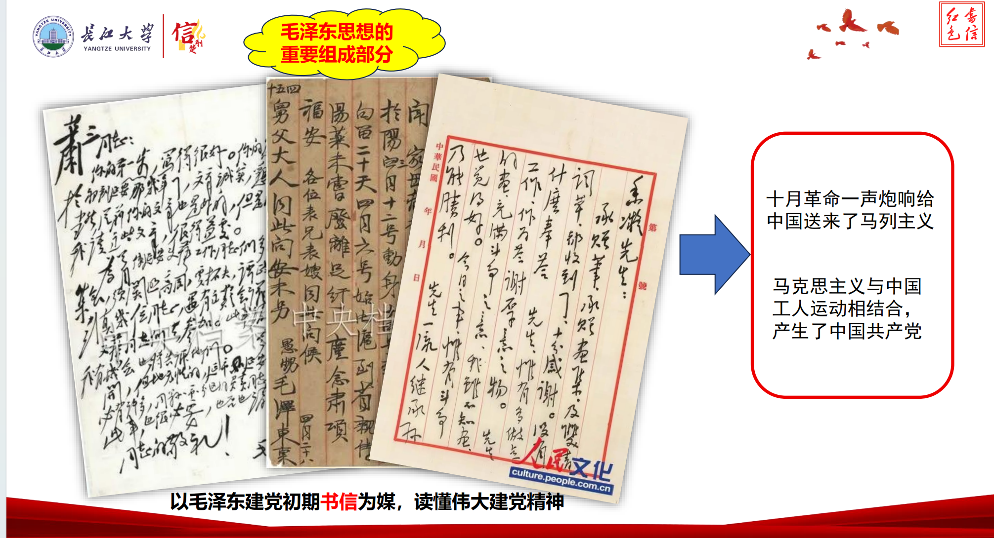 演讲ppt截图。一封封书信,是信仰的见证。刘小燕结合家书细节,解读伟大建党精神的丰富内涵。从“坚持真理、坚守理想”的执着追求,到“践行初心、担当使命”的实践探索;从“不怕牺牲、英勇斗争”的无畏气概,到“对党忠诚、不负人民”的赤子情怀,红色书信成为解码伟大建党精神的生动载体。