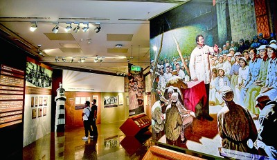 特展展出的油画作品《杨家岭延安文艺座谈会旧址》。王晓溪摄/光明图片