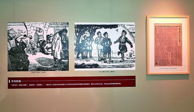 特展展出的木刻版画和《解放日报》1943年刊发的版面。中国作协供图
