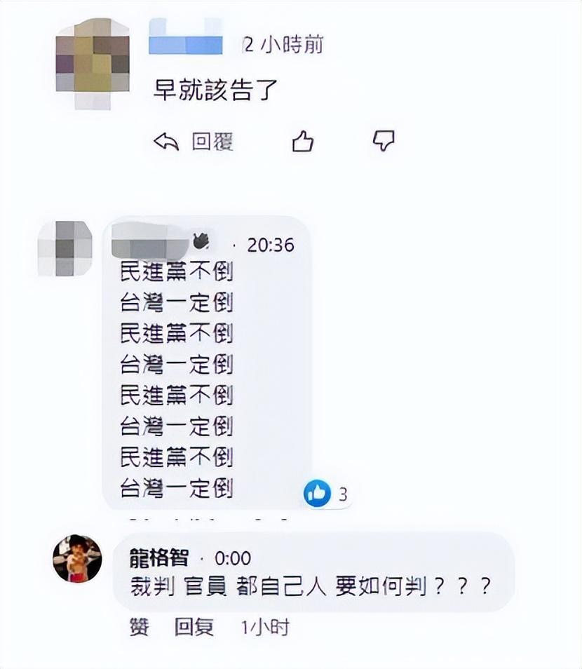 还有人称,“早就该告了。”“民进党不倒,台湾一定倒。”“裁判、官员都自己人,要如何判?”↓