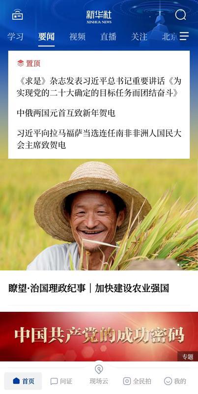 全新版本新华社客户端,置顶区展示重要新闻发布、重大政策发布等,“万山磅礴看主峰”,权威内容体现新华社的政治站位和国家通讯社属性。