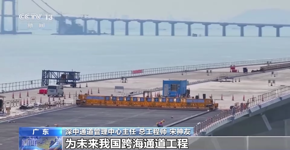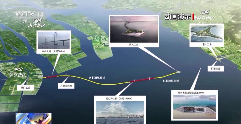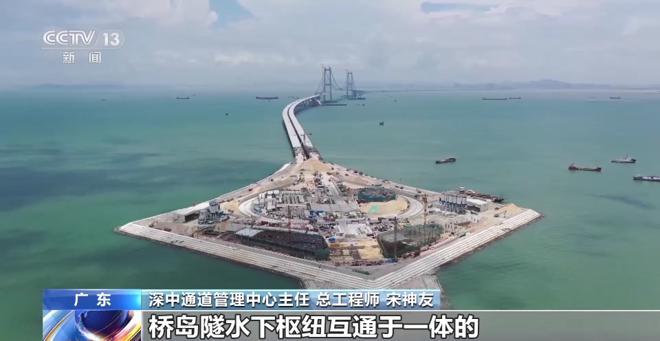 深中通道管理中心主任、总工程师 宋神友:未来,珠江西岸的人跟深圳机场以及前海实现快速交通转换,就是通过在东岸设置了一个高速公路水下枢纽互通立交的形式,所以最终这个项目就是采用了桥岛隧水下枢纽互通于一体的跨海集群工程。