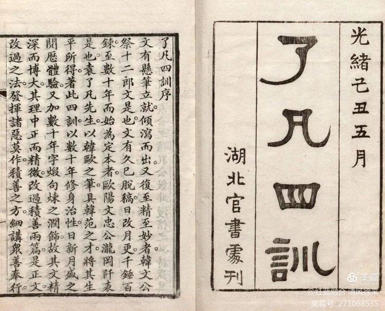 4.《了凡四训》,是明代思想家袁黄创作的种德立命、修身治世类教育著作,以“改过”、“积善”为思想核心,强调从治心入手提升自我修养,是一部具有劝善性质的家训著作。“务要日日知非,日日改过;一日不知非,即一日安于自是;一日无过可改,即一日无步可进”,强调做官要自律自省,作“为官功过格”,将每日所做之事记录于上,每行一善记数,每有一过退除,将自身所行善恶量化,不断规范行为,提升自我,敦促自己始终保持一颗清正廉洁的为民之心。《了凡四训》包含了丰富的劝善思想,体现了廉洁修身的智慧,被誉为“东方第一励志奇书”。