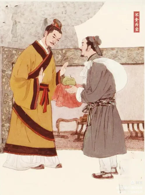 1.“子罕辞宝”:春秋时期,宋国有个人得到一块玉石,将它献给掌管工程的大臣子罕。子罕不肯接受,说:“我把不贪图财物的这种操守当作宝物,你把玉石作为宝物。如果你把宝玉送给了我,我们两人都丧失了宝物,还不如我们都保有各自的宝物。”故事中,子罕恪守“不贪为宝”的信条,巧妙拒玉,展现了清正廉洁的高尚品质。