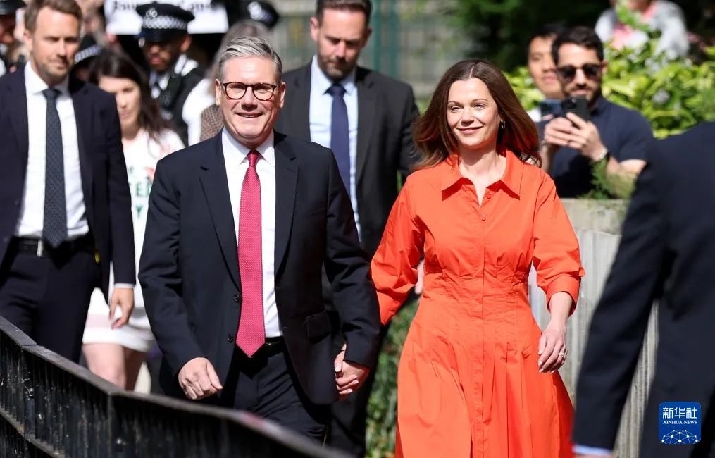 7月4日,在英国伦敦,英国工党领袖基尔·斯塔默(前左)与妻子前往一处投票站,准备投票。新华社记者 李颖 摄