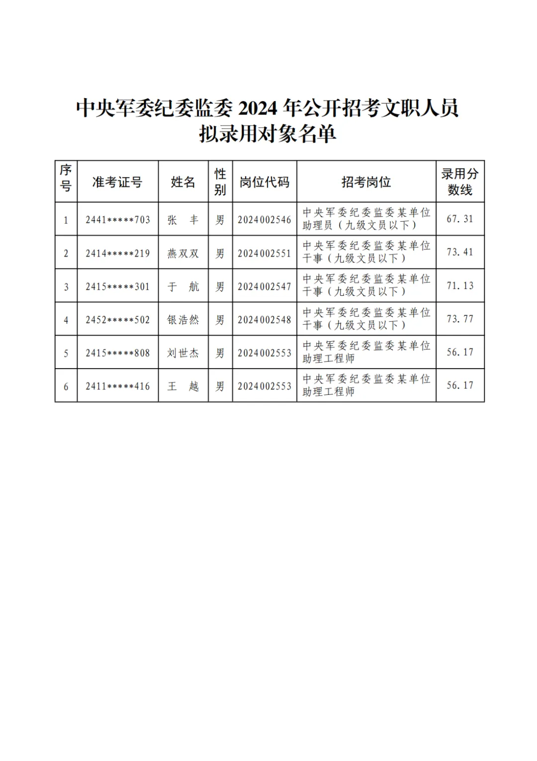 根据 2024 年全军公开招考文职人员计划安排,现将《中央军委纪委监委 2024 年公开招考文职人员拟录用对象名单》予以公示。公示期间,如对拟录用对象有异议或者需要反映问题,请与中央军委纪委监委有关业务部门联系,联系电话:010-66790382。
