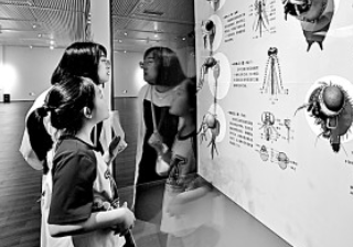 家长陪孩子在山东省青州博物馆观看世界珍稀昆虫标本展。王继林摄/光明图片