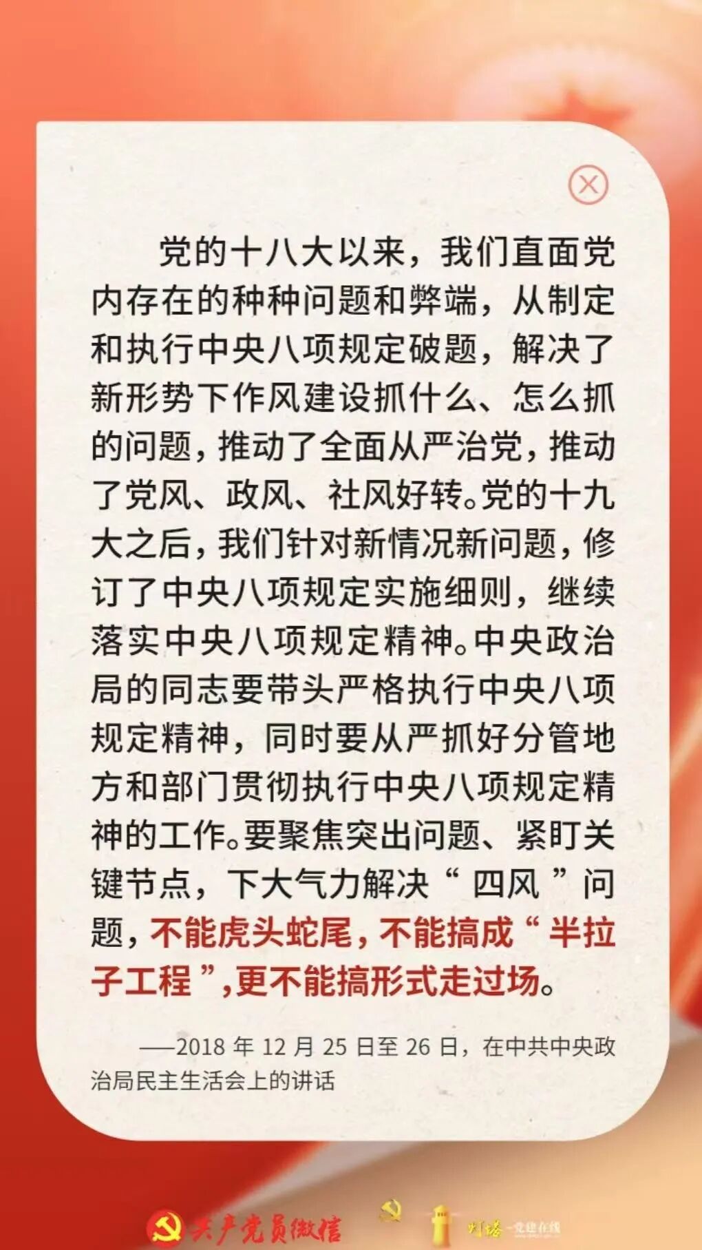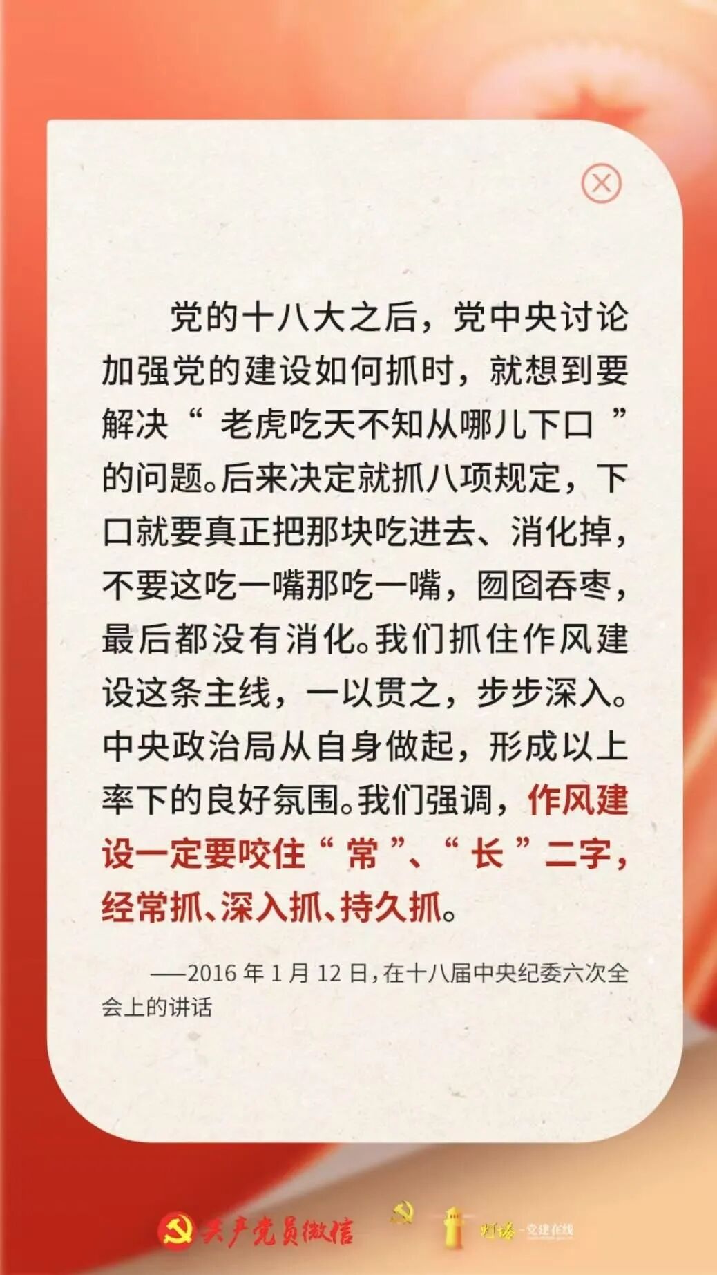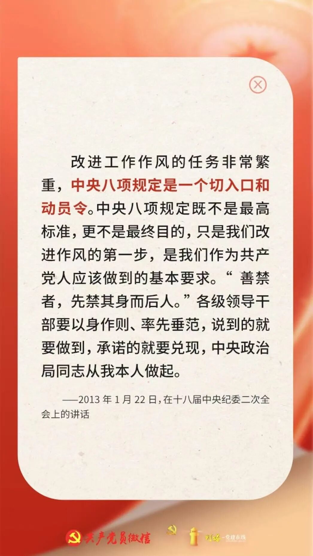 深入贯彻中央八项规定精神学习教育正在全党开展。这是中国共产党人以自我革命精神引领时代风气之先的再宣誓,是以中央八项规定“关键子”盘活作风建设“整盘棋”的再出发。党的十八大以来,习近平总书记多次强调以八项规定为切入点,驰而不息推进党风廉政建设,将全面从严治党推向纵深。(来源:共产党员微信)