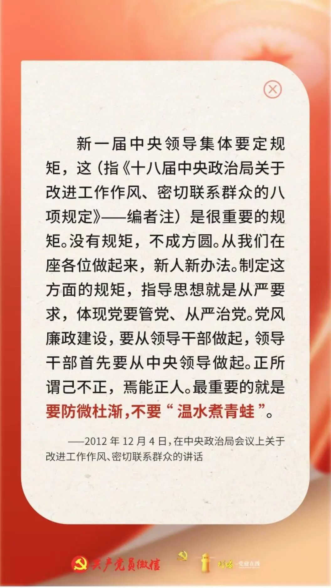 深入贯彻中央八项规定精神学习教育正在全党开展。这是中国共产党人以自我革命精神引领时代风气之先的再宣誓,是以中央八项规定“关键子”盘活作风建设“整盘棋”的再出发。党的十八大以来,习近平总书记多次强调以八项规定为切入点,驰而不息推进党风廉政建设,将全面从严治党推向纵深。