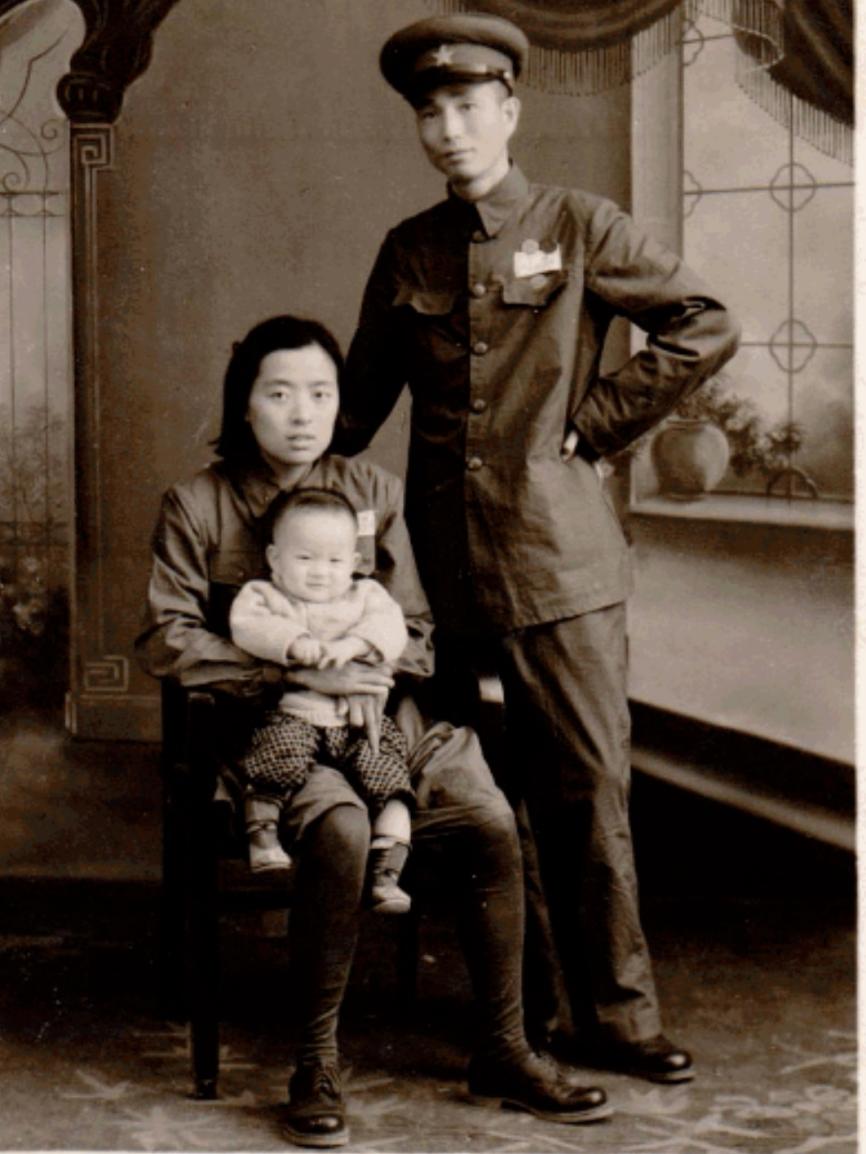 新中国成立初期在华东军大的衣向璞(时任华东军大子弟小学副校长兼教导员)罗义淮(时任华东军大教育部副部长兼高干团政委)夫妇,怀中抱着一周岁的长子罗小兵。