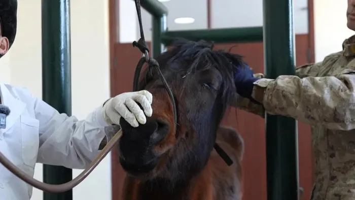 除了负责教学的军马教练,还有在医疗方面为军马健康保驾护航的军马医生。春节前夕,一匹军马持续腹泻,军马所所长长福每天给它扎针灸,还自己调配药方给军马喂中药,通过鼻胃管灌服。