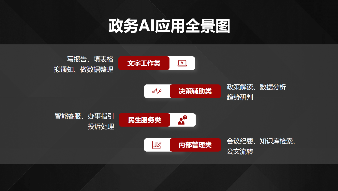 那么,AI具体能在政务领域做什么?刘兴亮在辅导中系统梳理了政务AI的应用场景。他将政务AI应用归纳为四大类:文字工作类,包括写报告、填表格、拟通知、做数据整理;决策辅助类,涵盖政策解读、数据分析、趋势研判;民生服务类,涉及智能客服、办事指引、投诉处理;内部管理类,包括会议纪要、知识库检索、公文流转。