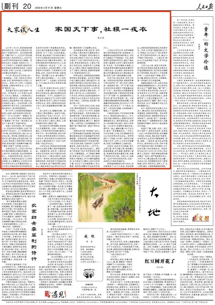 89岁的中国工程院院士、“八一勋章”获得者钱七虎在4月15日出版的《人民日报》副刊版撰文《家国天下事,社稷一戎衣》,提及举家逃难、聆听钱氏家训、与爱人两地分居16载、在家乡设立“瑾晖”基金等经历。
