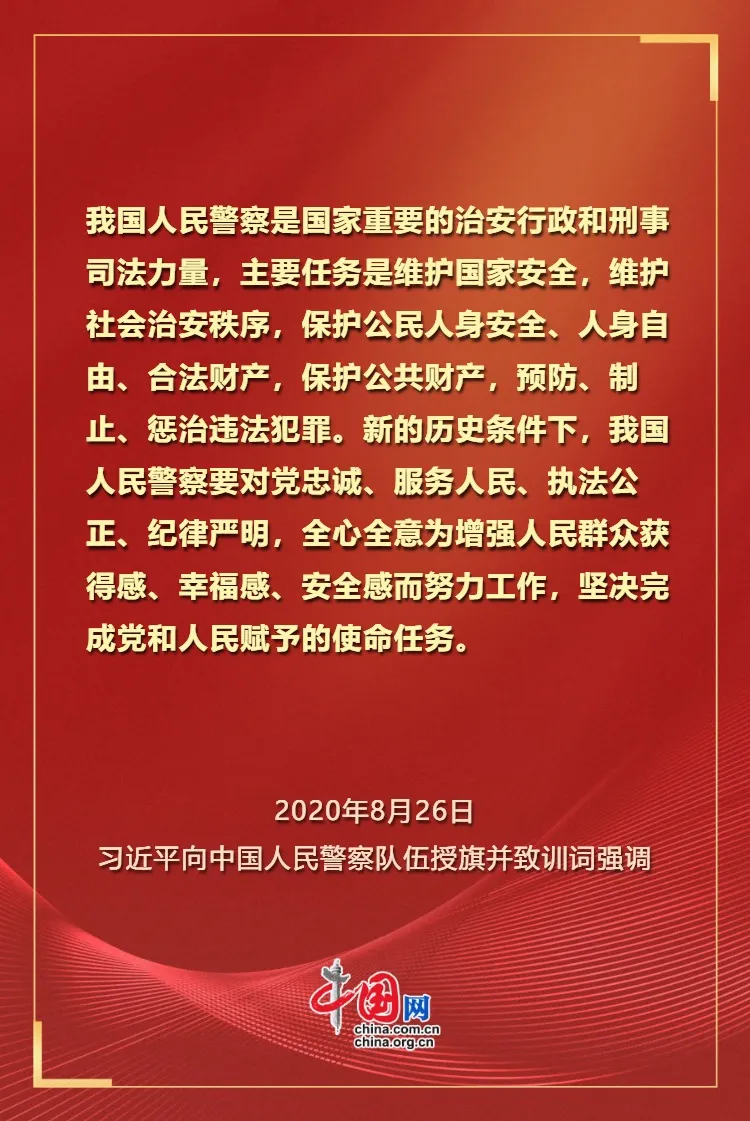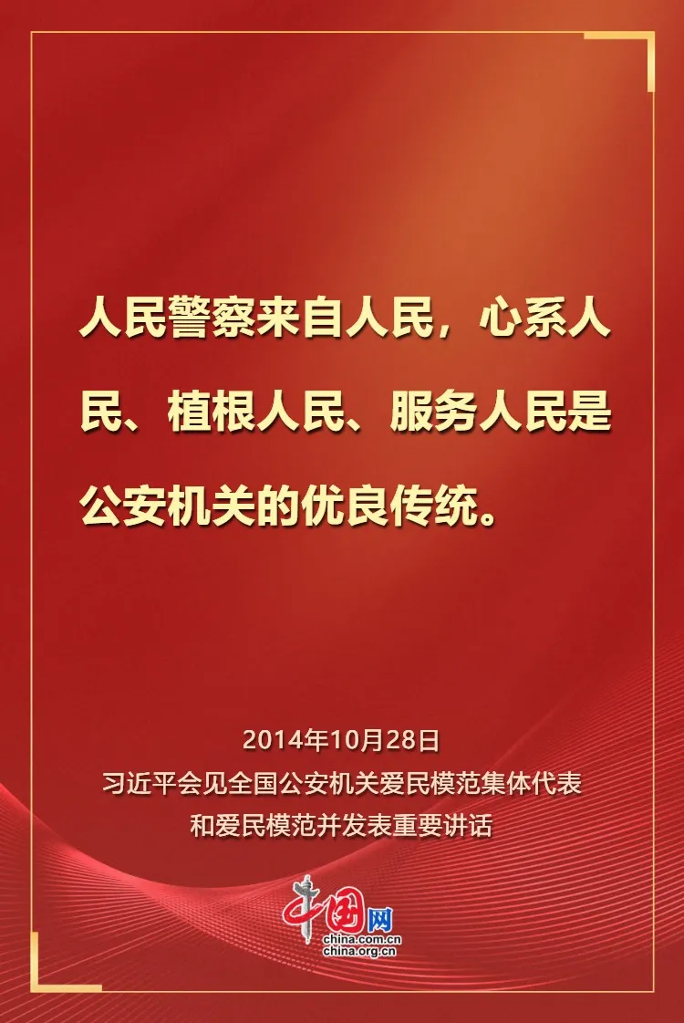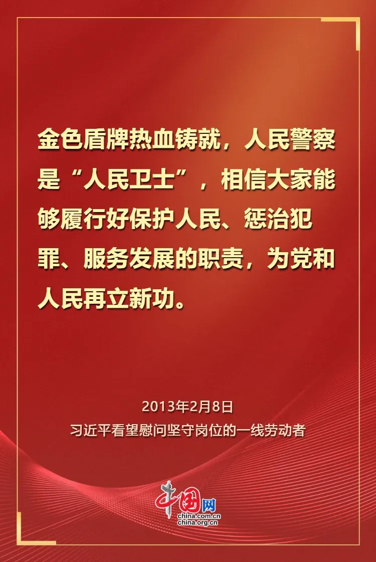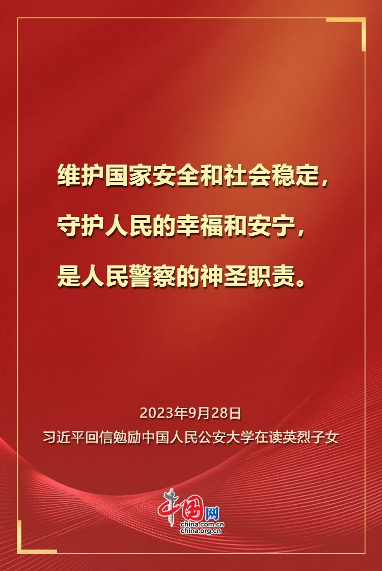 值此第六个中国人民警察节来临之际,让我们重温习近平总书记对人民警察充满力量与温度的关怀。向每一位日夜守护、无私奉献的人民警察致以崇高的敬意和最真挚的祝福。愿他们牢记嘱托,砥砺前行,继续以热血和忠诚铸就平安之盾,守护万家灯火,不负时代,不负人民!