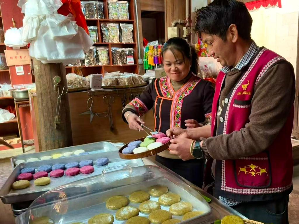 2026年1月27日,云南省腾冲市清水镇司莫拉佤族村村民李发顺夫妇正在为游客打包大米粑粑。新华社记者熊轩昂摄