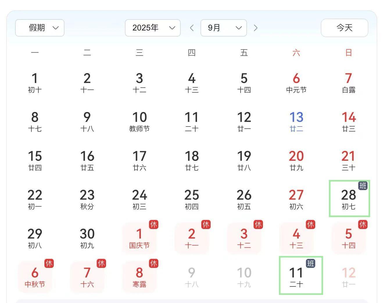 八天小长假来啦!根据国务院办公厅关于2025年部分节假日安排的通知,国庆节逢中秋节将合并放假8天。9月28日(周日)10月11日(周六)要上班,10月1日(周三)至8日(周三)放假调休。