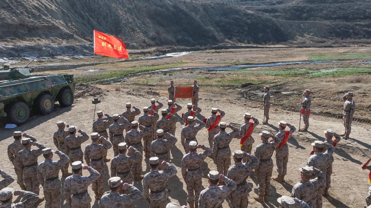 2025年,“刘老庄连”参加演习前,官兵面向连旗宣誓。(谢沅鑫摄)