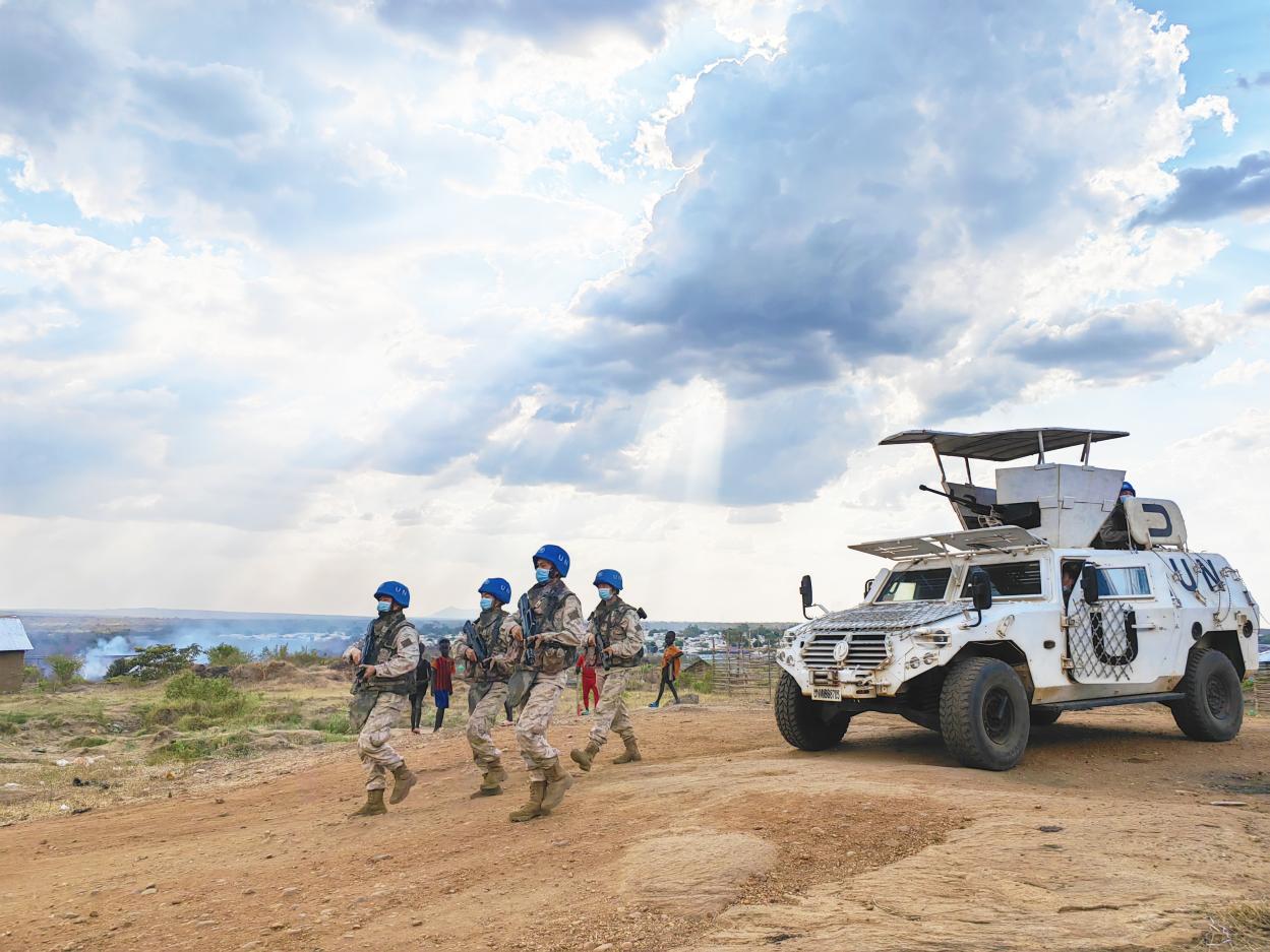 2023年,“刘老庄连”维和官兵在任务区执行徒步巡逻。(任郭洋摄)