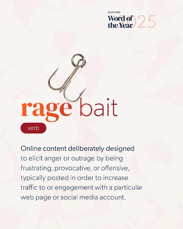 流量焦虑!《牛津词典》公布2025年度词汇:愤怒诱饵!牛津大学出版社《牛津词典》在其官网公布了其年度词汇——ragebait(愤怒诱饵)。根据《牛津词典》官方定义,ragebait(名词)指故意设计成令人沮丧、挑衅或冒犯形式的在线内容,旨在引发愤怒或愤慨,通常是为特定网页或社交媒体账号引流、提升互动量。该词由“rage”(爆发的愤怒)和“bait”(诱饵)组合而成,字面意为“愤怒诱饵”。ragebait为何入选2025年牛津年度词汇?过去一年,“ragebait”的使用量激增三倍,反映出公众对网络生活带来的负面影响的认知加深。这一现象表明了社交媒体算法和愤怒内容的成瘾性如何加速人们卷入二元对立的争论中,同时揭示了媒体行业的普遍趋势——愤怒内容往往能带来更高的参与度。